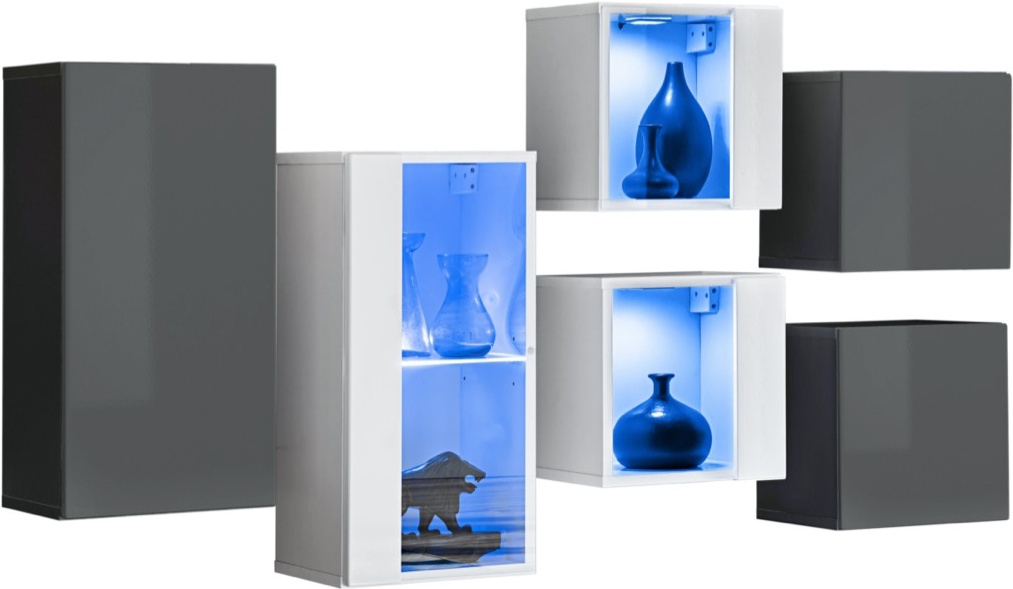 Vitrina: 30 x 60 x 25 cm; Sieninė spinta: 30 x 60 x 25 cm; 2 vitrinos: 30 x 30 x 25 cm; 2 pakabinamos spintelės: 30 x 30 x 25 cm