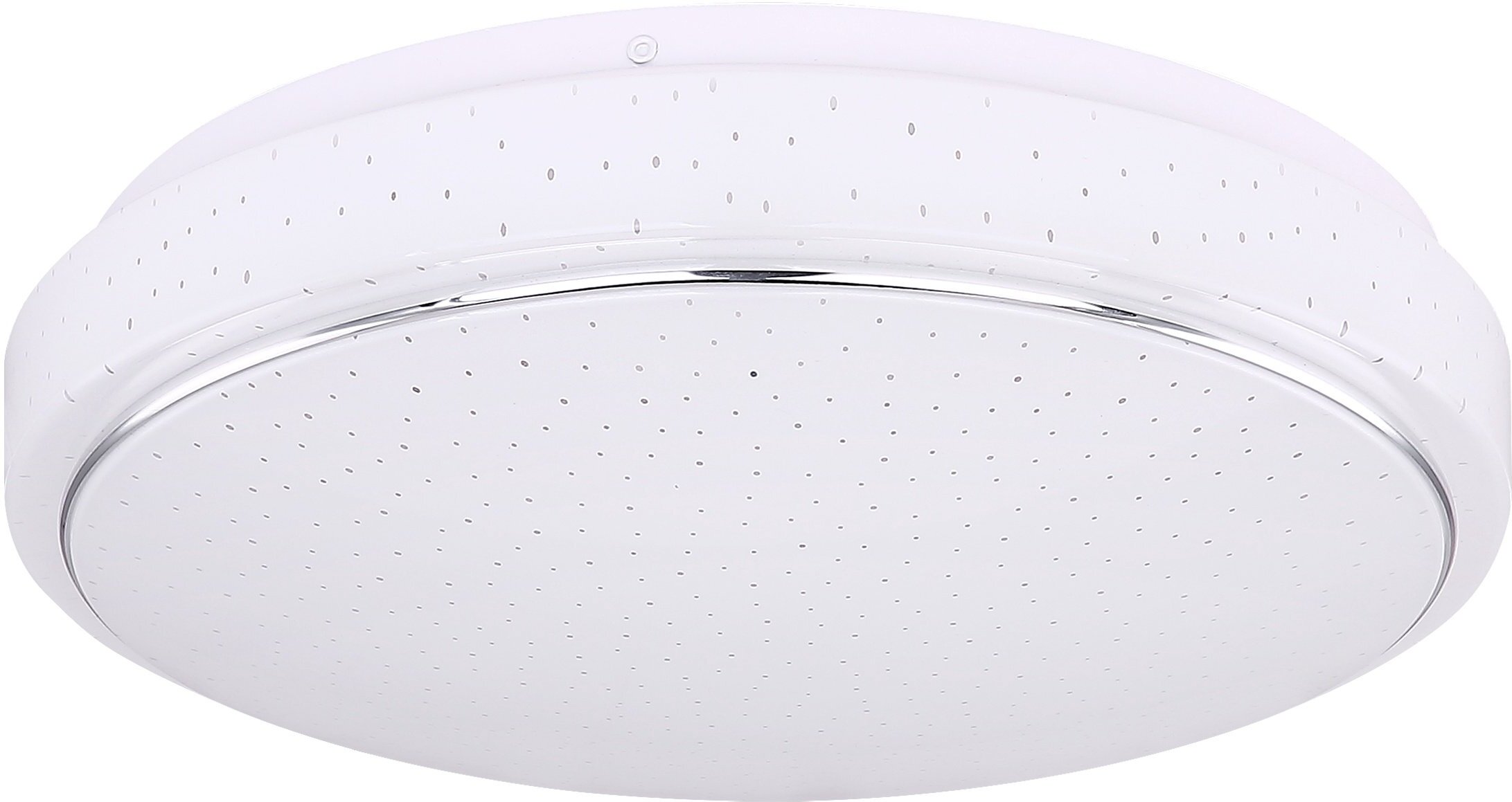The round (28.5cm) ceiling lamp KALLE scores with its appearance. Made of white metal and opal plastic with sparkle optics, this ceiling lamp has an included 18 Watt LED bulb. Decorated with chrome rings, this interior luminaire provides 1300 lumens of strong light and can be used universally in your living space.