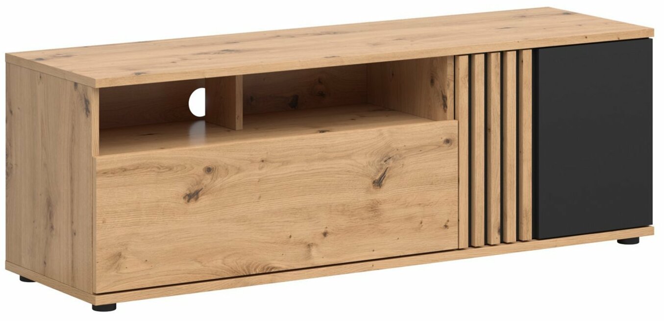 Šis TV staliukas su lentelėmis siūlo universalų saugojimą. Atvira lentyna suteikia lengvą prieigą prie konsolės ar priedėlio, o erdvi spintelė su lentyna padeda susidėti žaidimus, žurnalus ir kitus didesnius daiktus. Taip pat yra talpus stalčius įvairiems smulkiems daiktams laikyti. 135,5 cm pločio, 40 cm gylio ir 46,5 cm aukščio jis taip pat gali tilpti į mažesnes erdves, siūlydamas praktiškus sprendimus.