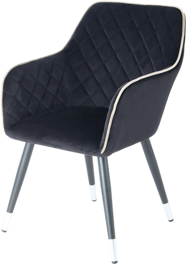 Velvetinis užvalkalas turi kontrastingą kraštą, kuris dizainui suteikia stilingą vizualinį akcentą. Sėdimosios dalies karkaso puošnumą sukuria ne tik spalvos, bet ir patrauklios dygsniuotos siūlės, išdėstytos rombo raštu ir puošiančios atlošo bei porankių vidinę pusę. Dekoratyvinės siūlės atrodo elegantiškai ir paverčia kėdę ypatingu baldu. Tvirtos metalinės kojelės suteikia kėdei stabilų stovą ir kartu užbaigia kilnią išvaizdą, nes kojos yra su metaliniais pagrindais.