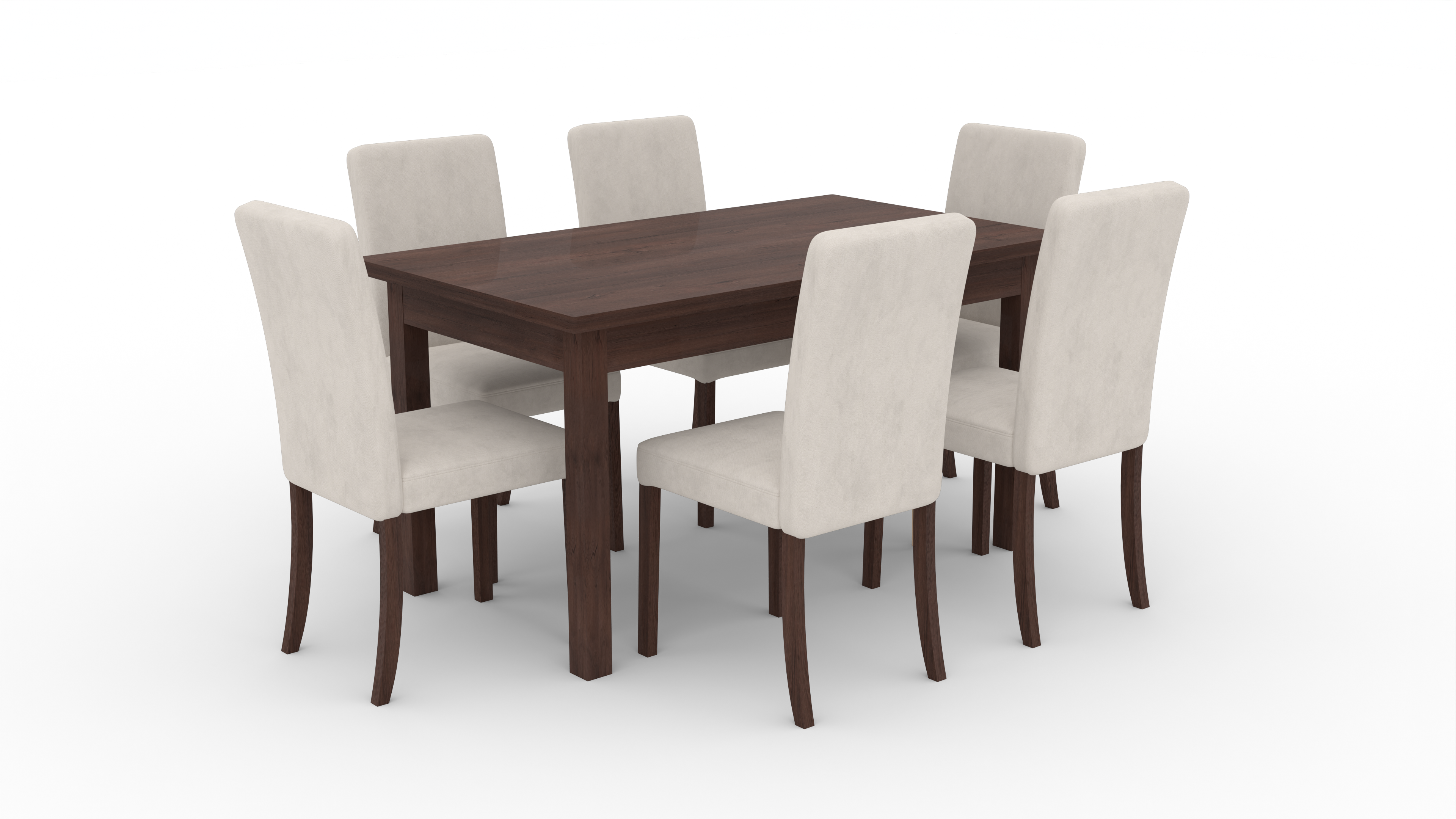 Rhodes 81 komplektas puikiai tiks jūsų valgomojo kambariui. Komplektą sudaro stalas su stačiakampiu stalviršiu ir šešios apmuštos kėdės. Stalą galima išskleisti su įdėklu, kuris prailgina stalviršį iki 180 cm. Stilingos kėdės turi tvirtas buko medžio kojas ir apmuštą sėdynę bei atlošą bet kokia jūsų pasirinkta medžiaga iš galerijoje pateiktų. Dėl plataus spalvų pasirinkimo šis komplektas tiks bet kokiam interjerui ir papildys jūsų svetainę, virtuvę ar valgomojo kambarį....
