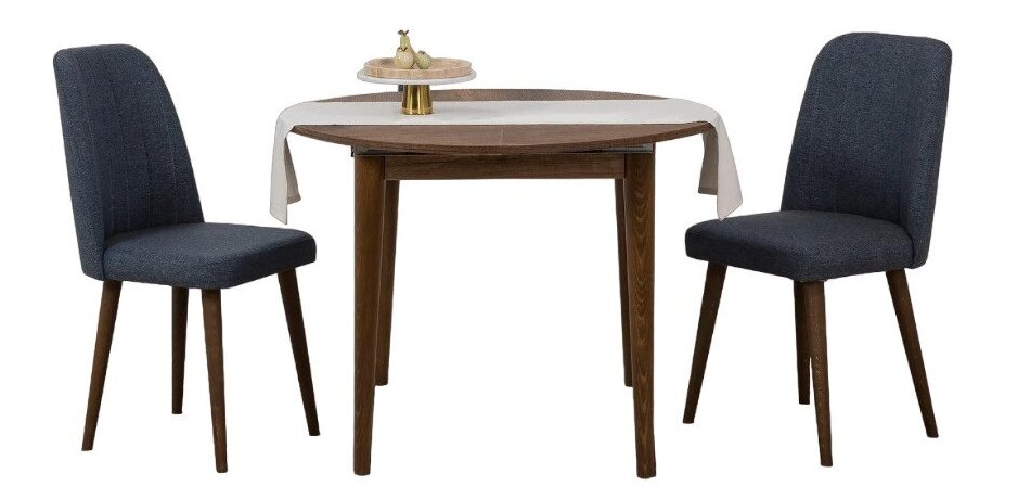 Šį valgomojo komplektą sudaro stalas ir dvi kėdės, pagamintos iš 100% melaminu dengtos medienos drožlių plokštės, kurios storis yra 18 mm. Stalas turi medines kojas ir gali būti konfigūruojamas dviem dydžiais: