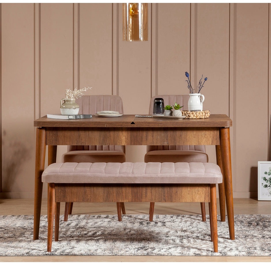 Vina valgomojo komplektą sudaro išskleidžiamas stalas, 2 kėdės ir suolas be atlošo. Komplektas pagamintas iš melamino. Kėdės ir suolai aptraukti maloniu audiniu. Išskleisto stalo matmenys 129 x 80 cm, jį galima išskleisti iki 163 x 80 cm, todėl jis suteiks patogią erdvę valgyti didesniam žmonių skaičiui.Įprasta kaina