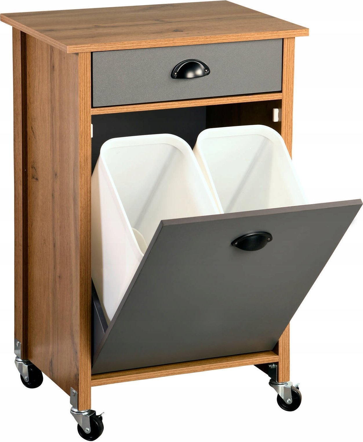 Tamsiai rudas korpusas derinamas su tamsiai pilku fasadu, kuris suteikia virtuvės vežimėliui modernumo ir natūralumo įspūdį. Apatinėje spintelėje yra dvi šiukšliadėžės. Kiekviena jų turi praktišką žiedą šiukšlių maišams pritvirtinti.