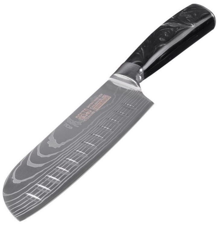 Unikalus lazerinis Damasko lipdukas ir specialiai suprojektuota rankena su juodo marmuro akmeniu - tai būtent tie peilio aprašymai, kurių jums nereikėjo iki tol, kol nepradėjote jų naudoti savo gyvenime. Jie ne tik akivaizdžiai įkvepia prabangos aurą, bet ir derina moderniąsias technologijas su senovine Damasko plieno klastojimo praktika. Tai savo ruožtu sugrąžina senąją gaminimo praktiką, kurią visi mes dalinamės su savo protėviais, į jūsų šiuolaikinę virtuvę, su visais šiuolaikiniais patogumais ir technologijomis, kurios leidžia pasiekti kulinarinio verslo viršūnę.