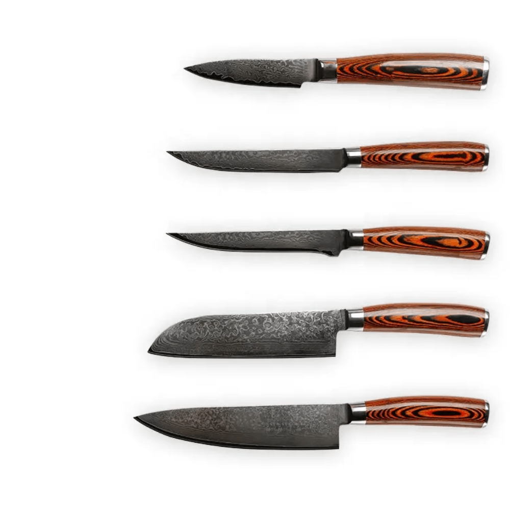 Damasko Plieno Virtuvinių Peilių Rinkinys Usugiri D-02 pagamintas iš naujoviško, atsparaus korozijai, kombinuoto VG10 Damasko plieno, turinčio 67 sluoksnius. Šis plienas yra ypač atsparus korozijai ir itin kietas – dėl šios priežasties peilių ašmenys taip ilgai išlieka aštrūs. Peilis papuoštas Pako medžio rankena.