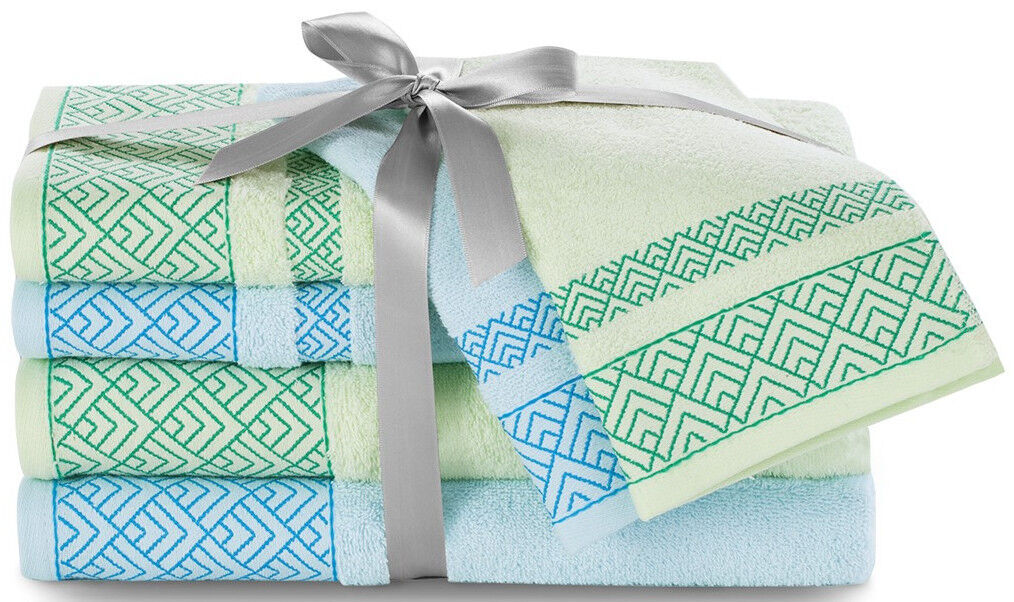 Komplekte: 2 maži rankšluosčiai, kurių matmenys 30 x 50 cm. 2 vidutiniai rankšluosčiai, kurių matmenys 50 x 90 cm. 2 dideli 70 x 140 cm rankšluosčiai. Maksimali skalbimo temperatūra 40°C laipsnių