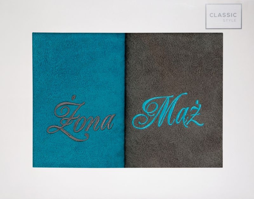 The towels are made of refined cotton, called combed, with a grammage of 400g/m2. They absorb water perfectly from the first use. A very important feature is that the towels become fluffier with use, and the embroidery on them is dense and durable. The set is very effectively packed in a box. High quality and very competitive price. Perfect for your own interior design or as a gift! The photo shows the appearance of the towels, but please remember that each computer displays colors according to its own settings and properties. Dimensional tolerance +/-3%. Wash before first use. Washing instructions on the label.