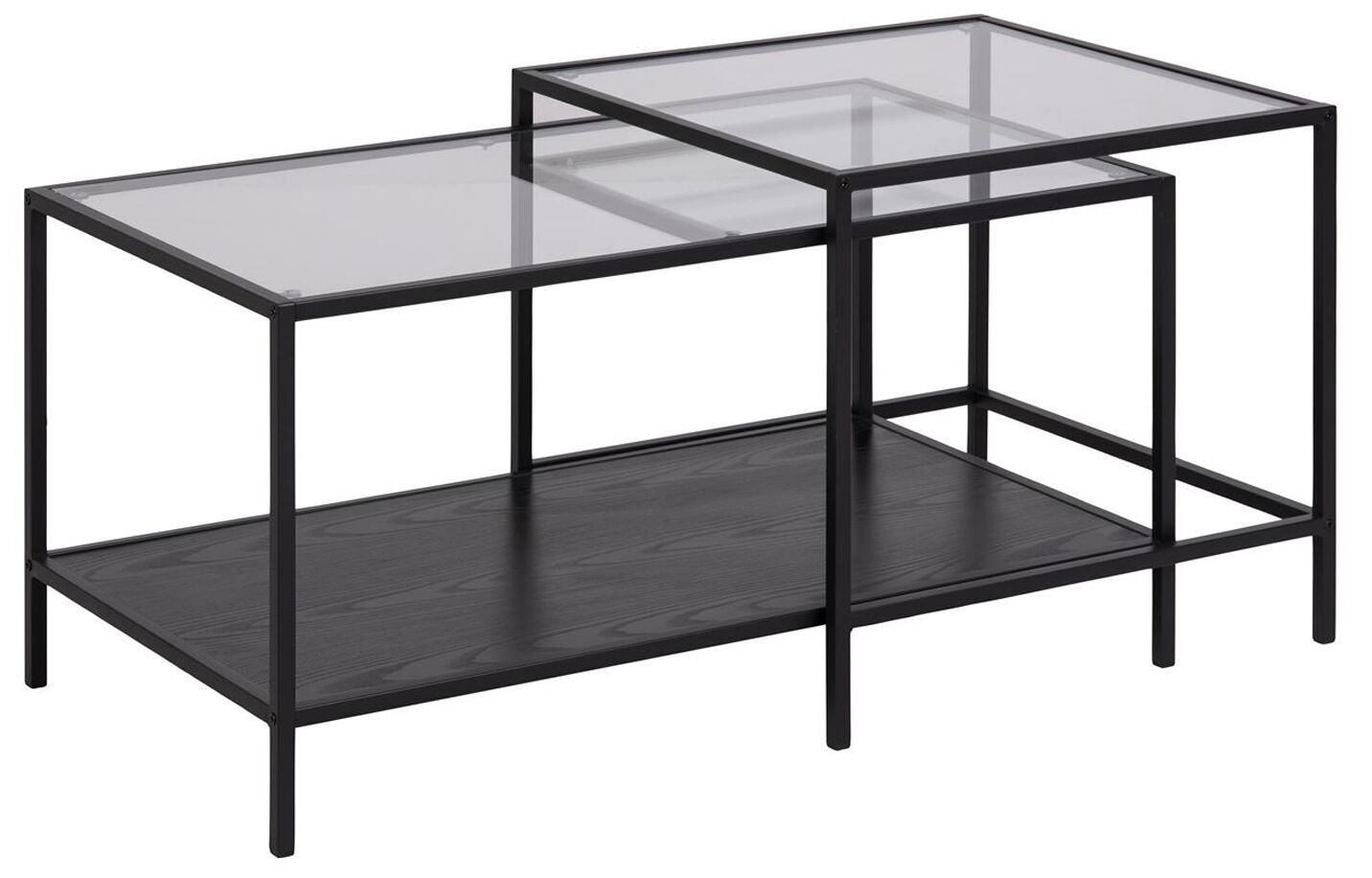 Šis „Seaford“ kavos staliukų komplektas pasižymi kvadratiniu/stačiakampio formos dizainu su skaidriu grūdinto stiklo stalviršiu. Rėmas ir pagrindas pagaminti iš matinės juodos spalvos, grubiai milteliniu būdu dengto plieno. Į komplektą įeina du kavos staliukai, kurių kiekvienas yra 90x55x50 cm dydžio.